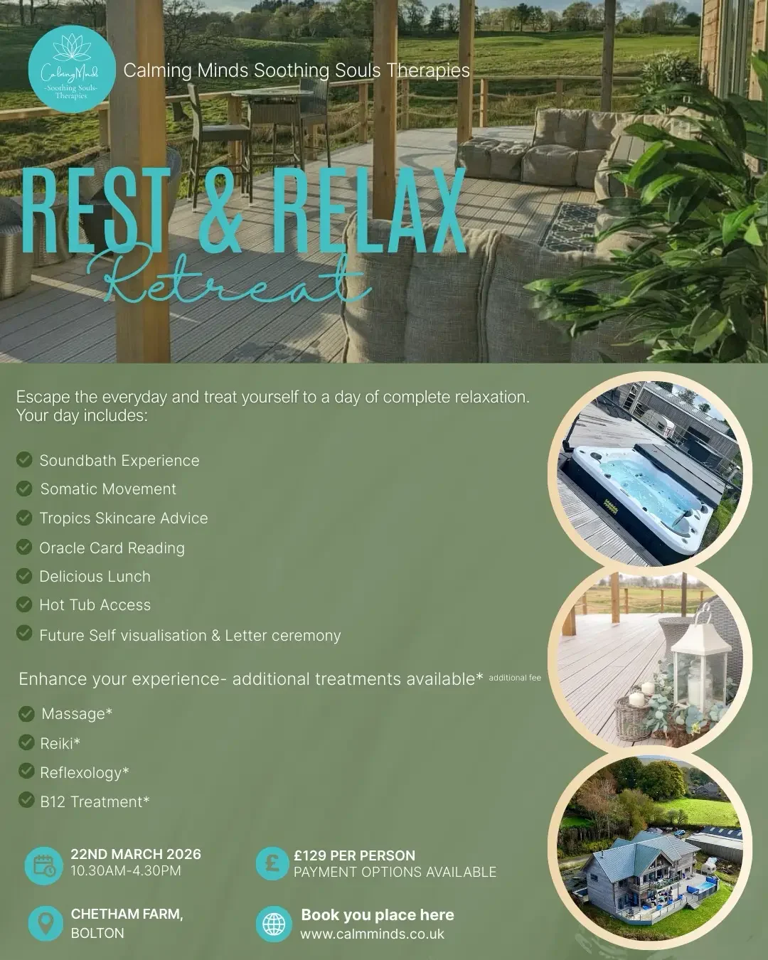 Escape the everyday and treat yourself to a day of complete relaxation. Set in the stunning Bolton countryside, our retreat combines therapeutic treatments, delicious food, and luxurious facilities to restore your mind, body, and soul.